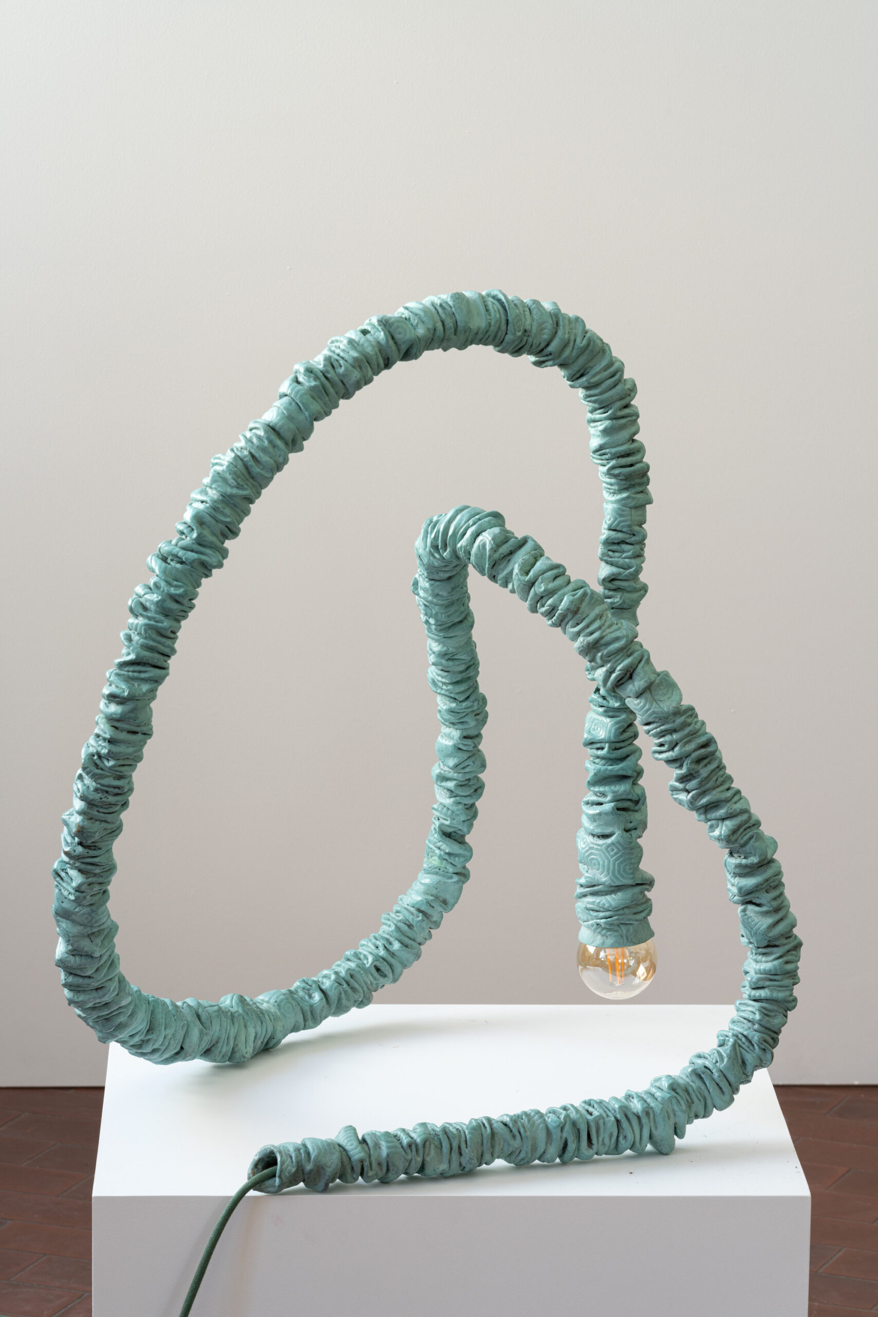 Pour la première fois, dans le cadre de l’initiative de design de ColAAb, Nicolas Momein a expérimenté la création d’un objet fonctionnel : un luminaire. Ce mobilier fait écho à ses sculptures tubulaires en métal cousues de Bulgomme, un matériau qui évoque l’enfance de l’artiste. Généralement utilisé comme sous-nappe pour ses qualités antitaches et antichocs, le Bulgomme forme des motifs spatiaux complexes grâce à ses plis.