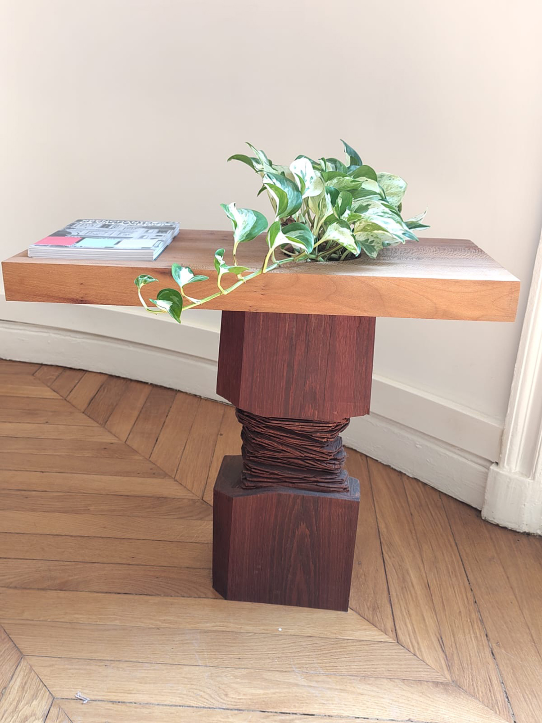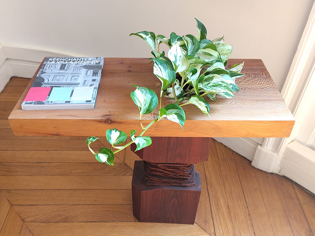 Le bout de canapé est constitué d’une épaisse planche de platane reposant sur un pied central, une bille de bois de padouk équarrie et sculptée. Les deux structures en bois, creusées, étanchéifiées à la cire d’abeille, accueillent un réservoir rond en terre crue (vide poches, pot pour fleurs ou plantes). Cette création est à la fois une œuvre d’art et un objet mobilier, un microcosme intérieur et son possible jardin miniature.