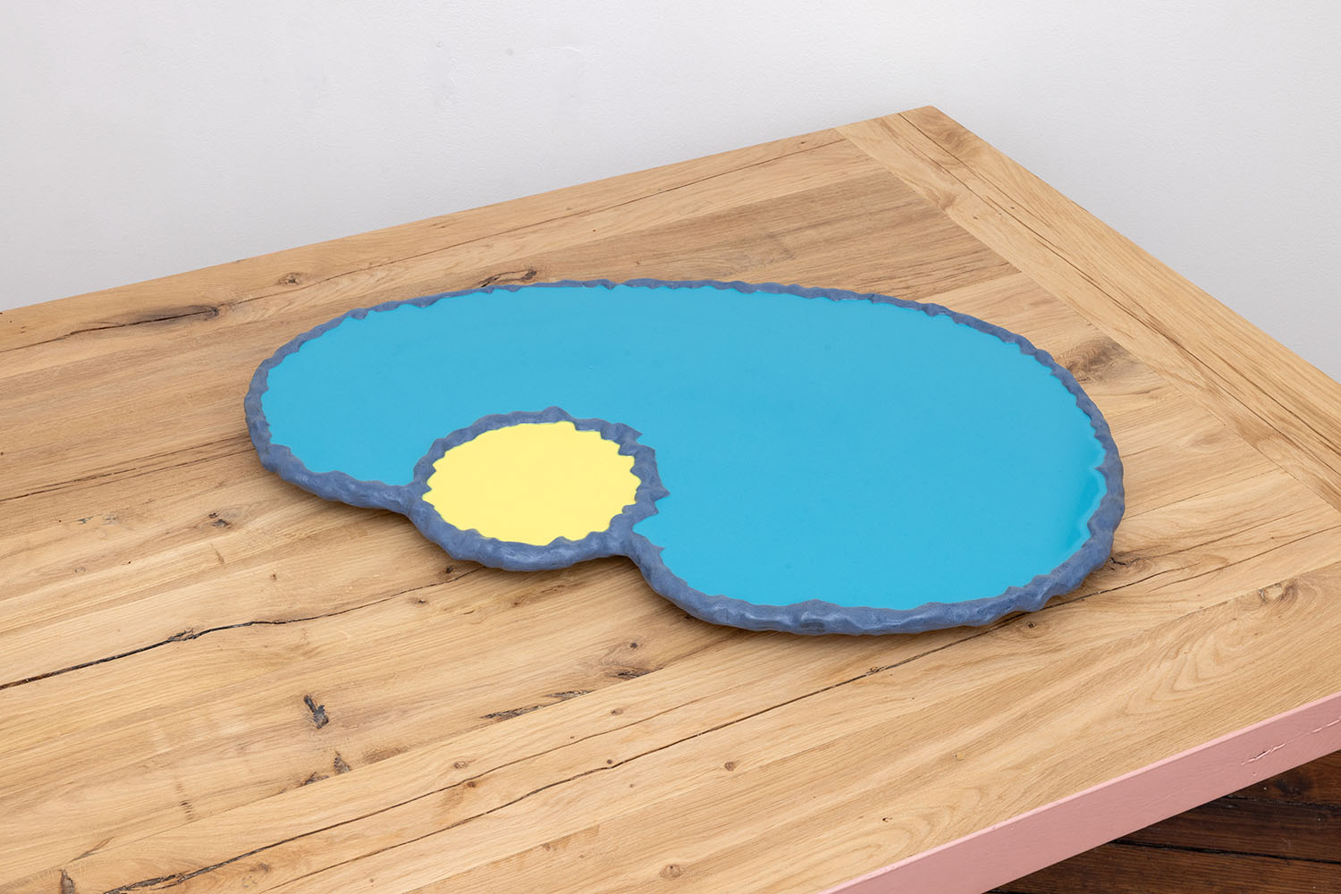 Dans la continuité des recherches amorcées avec la série Terre-plein, ce système transforme la ligne en fonction : il encadre et retient les couleurs, coulées pour se déployer en surfaces lisses et picturales. Le contraste entre la rudesse du façonnage et la douceur brillante des aplats produit une tension visuelle.