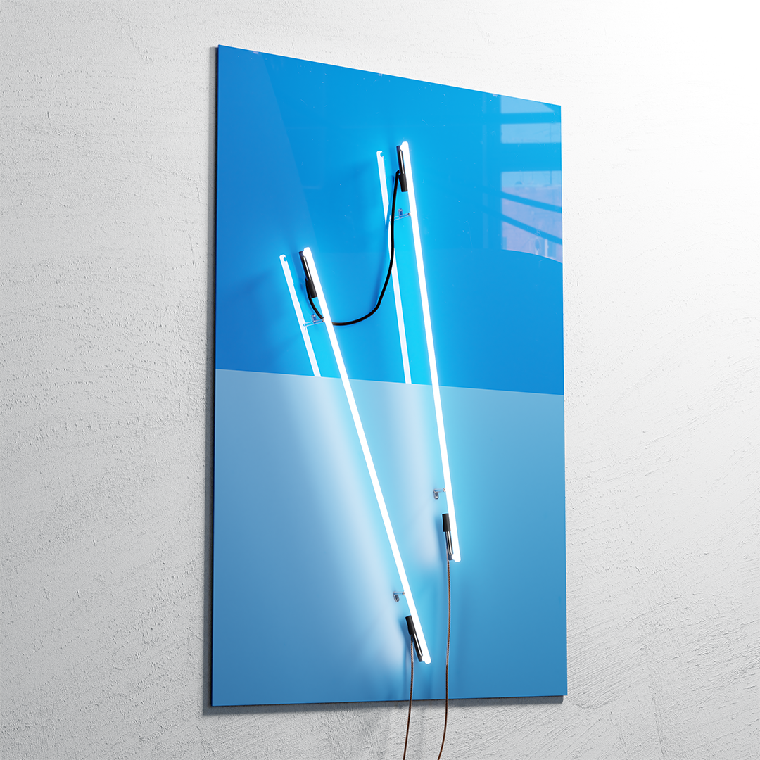 Le luminaire Minimal Light de Nicolas Delprat peut aussi être réalisé in situ par l’artiste ou par l’acquéreur selon les instructions délivrées avec le certificat. Minimal Light est composée de trois néons blancs disposés à équidistance à la verticale sur un wall-painting, divisé en deux à l’horizontale. En haut, le reflet des néons sur la surface laquée et brillante dédouble le motif et crée un effet miroir qui reflète l’environnement. Au-dessous, la surface mate d’un noir profond absorbe la lumière.