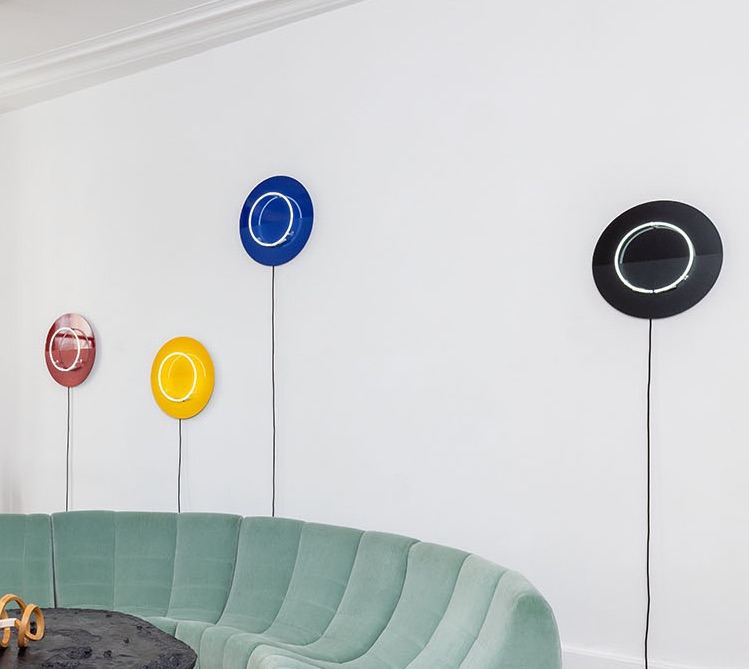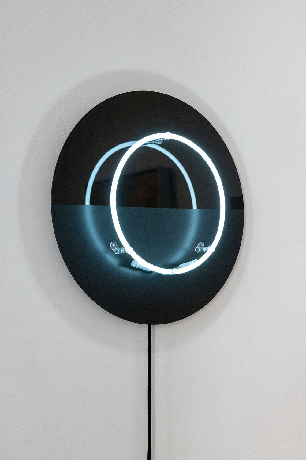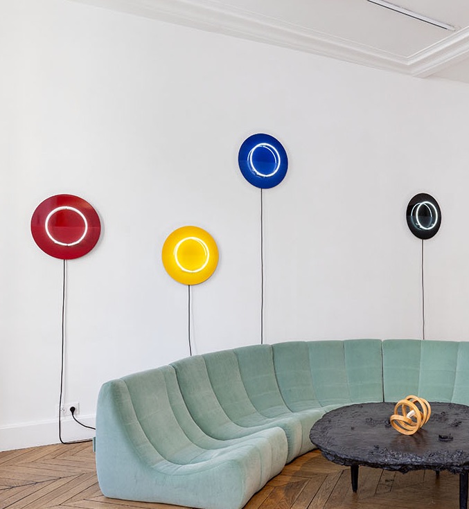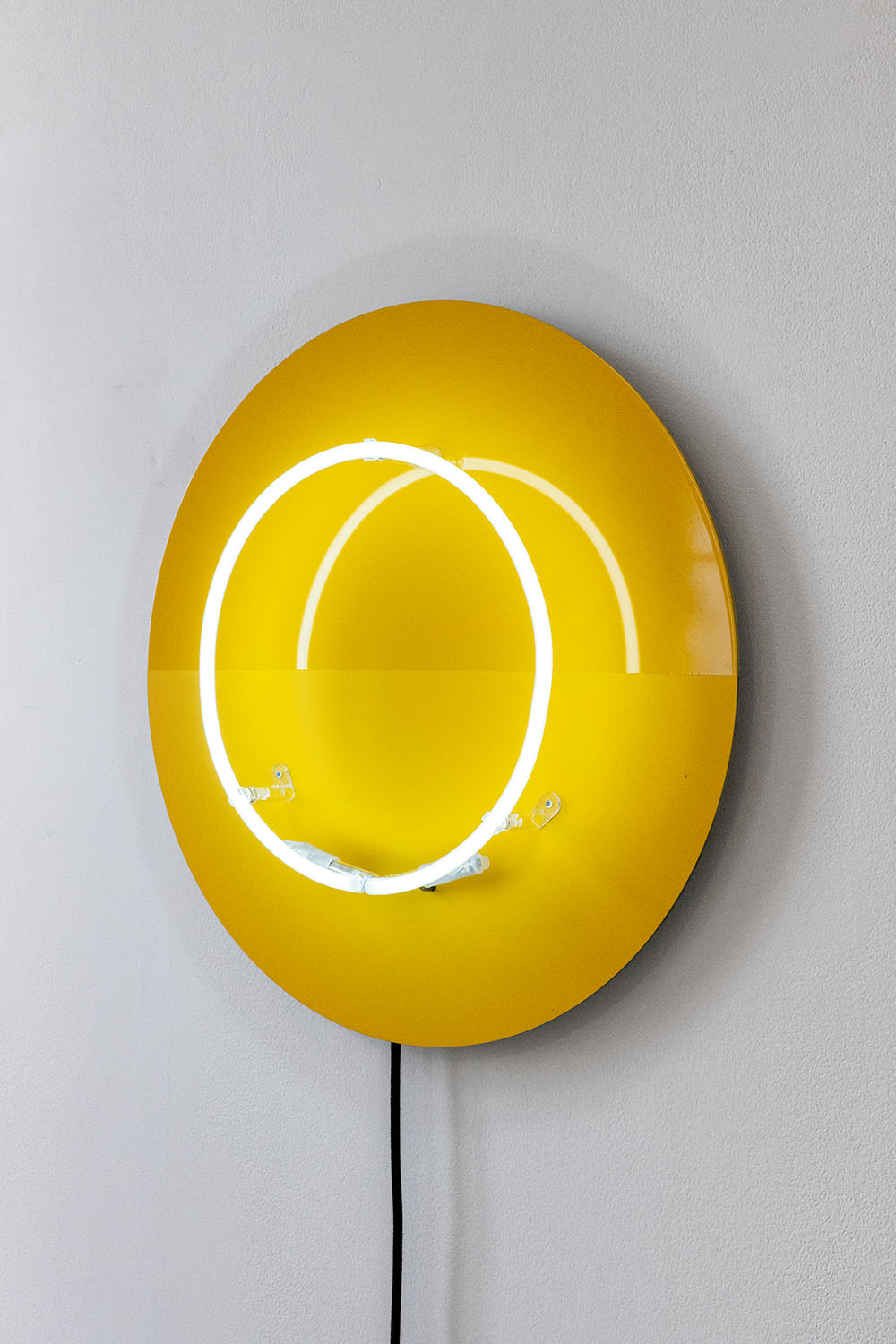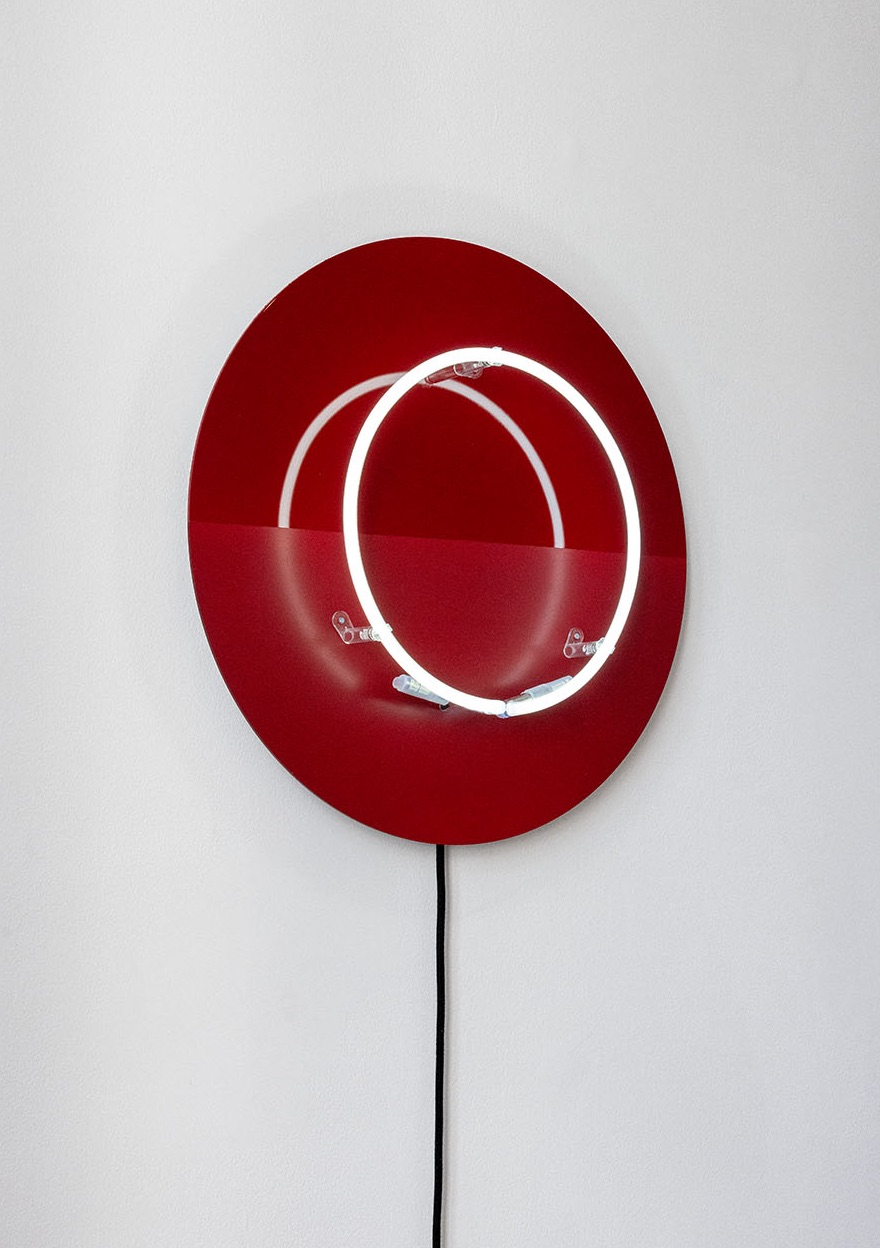 L’œuvre se compose de trois disques colorés -rouge, jaune et bleu - dont chacun est divisé horizontalement en deux parties: une zone supérieure en laque brillante et une zone inférieure en finition mate. Ce contraste de textures n’est pas uniquement esthétique: il influence directement la perception de la lumière. Un cercle de néon traverse les deux surfaces, dont il révèle les propriétés: la laque brillante capte et reflète sa lumière, tandis que la finition mate l’absorbe, créant un dialogue subtil entre éclat et opacité.