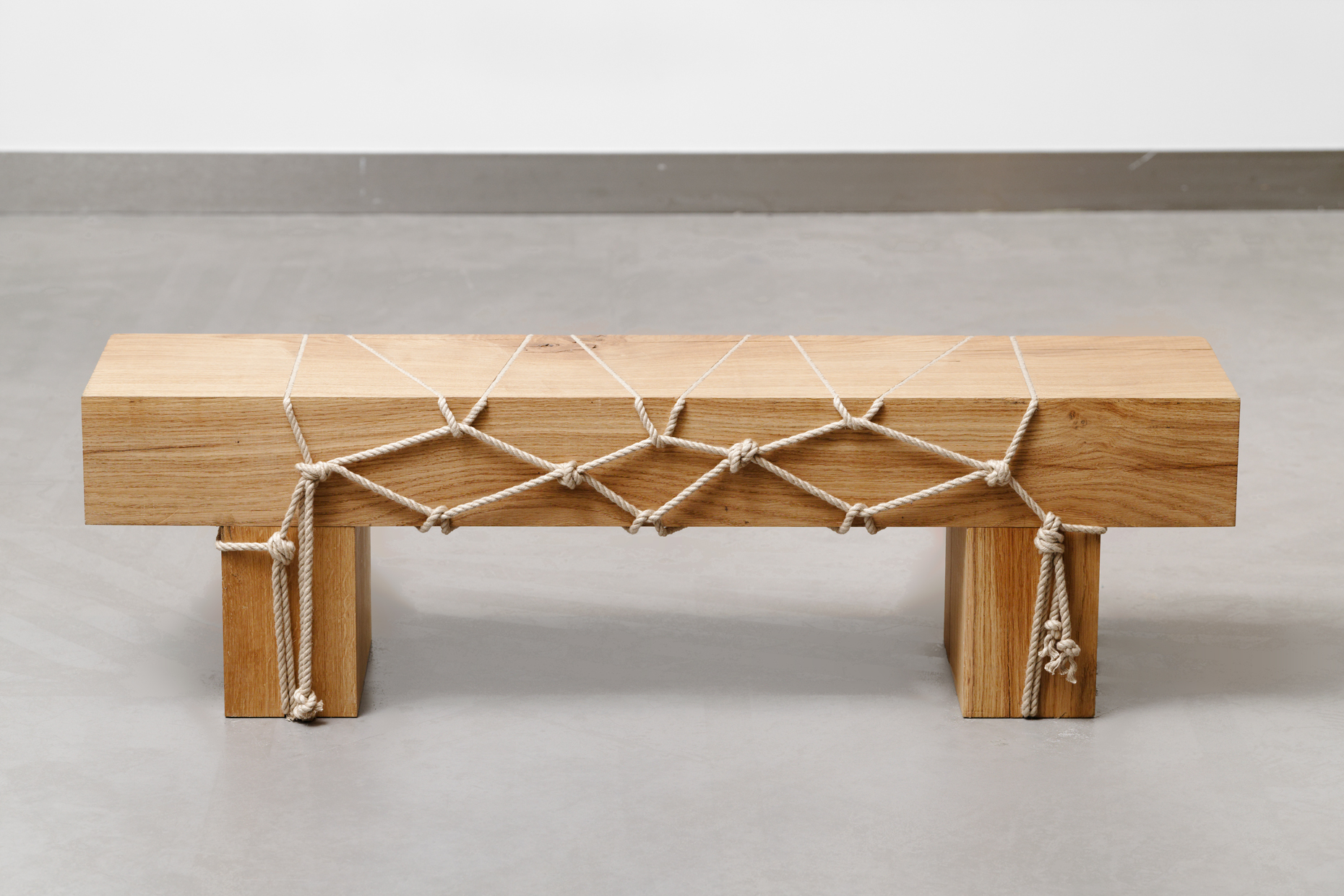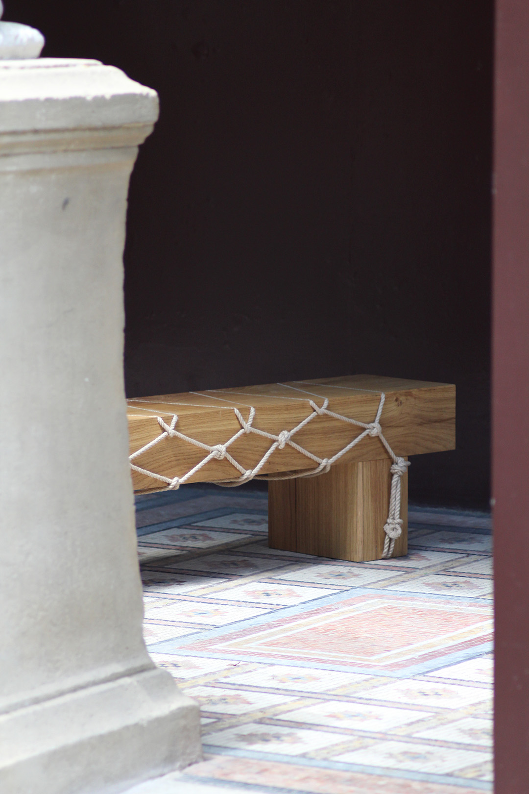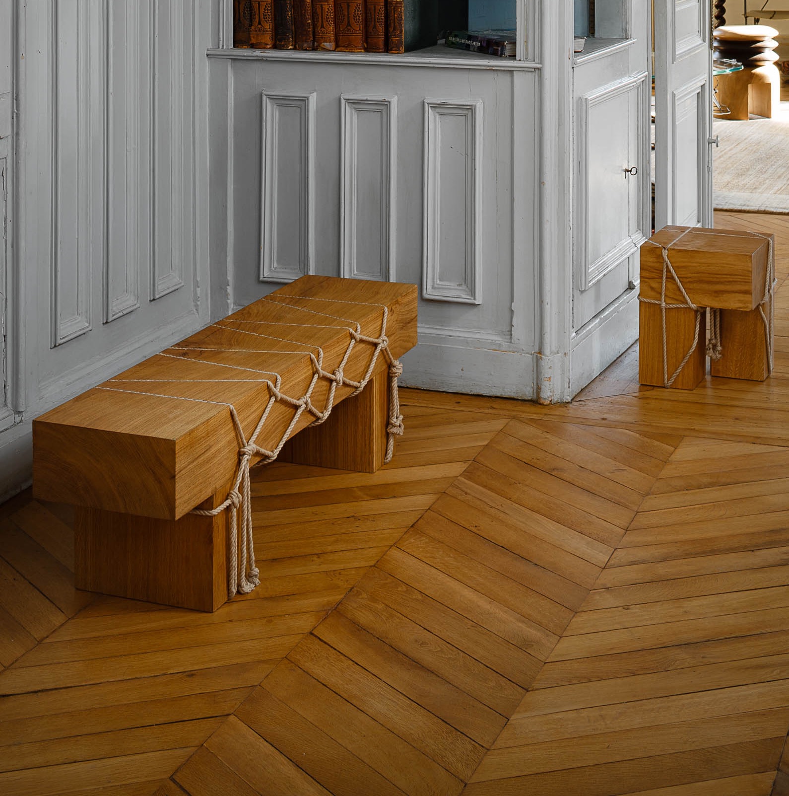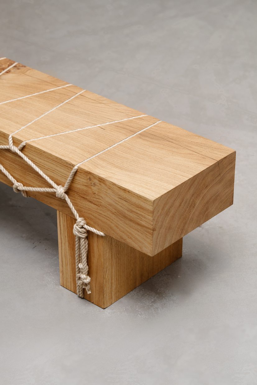 Pour ColAAb, Morgane Tschiember a réalisé dans un esprit minimaliste, entre art et design, la collection “Shibari” (banc, tabouret, table et console) inspirée de l’enseignement qu’elle a reçu des jardiniers japonais pendant sa résidence à la Villa Kujoyama à Kyoto.