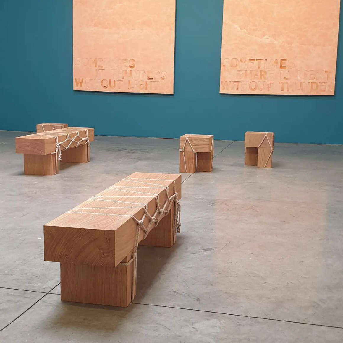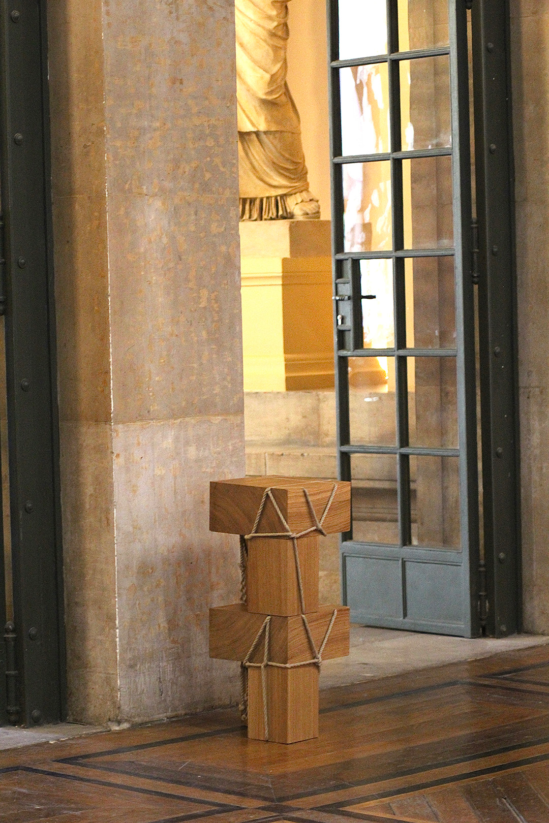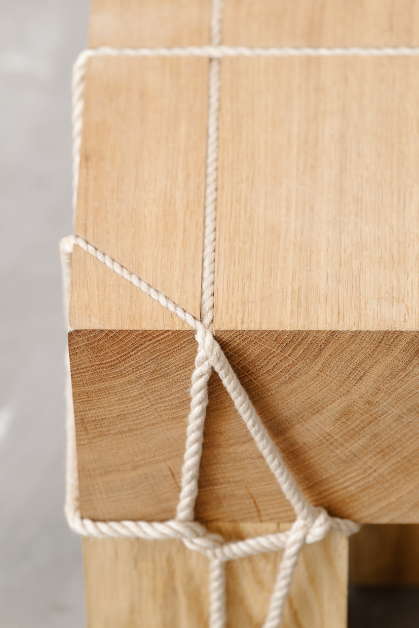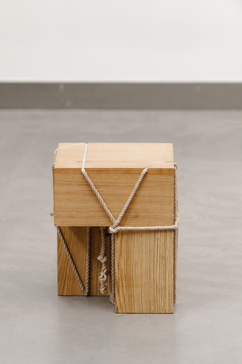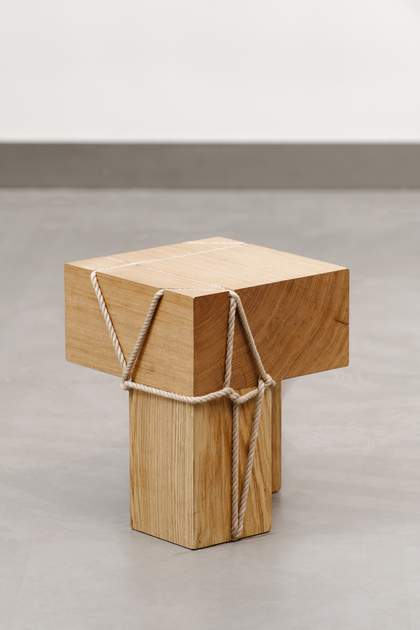 À la suite d’un séjour à la villa Kujoyama à Kyoto, Morgane Tschiember a commencé à suspendre certaines de ses sculptures dans la tradition du shibari japonais. Au Japon, le Shibari est un art millénaire, celui d’attacher. Un art et une technique venue des samouraïs, reprise dans certaines pratiques sexuelles, et utilisée par les jardiniers qui façonnent la forme des arbres en les ligaturant. L’artiste a réalisé pour ColAAb, dans un esprit minimaliste, entre art et design, des bancs, des tabourets, des tables et des consoles (Shibari Bench, Shibari Stool, Shibari Dining et Shibari Console) inspirés par l’enseignement reçu de ces jardiniers japonais. Les poutres - carrés et rectangles de chêne massif - polies et huilées, sont enserrées par des cordes en lin savamment nouées ; le bois, entaillé sur la surface « vient presque se refermer sur la corde ». Comme toujours pour l’artiste, il s’agit d’ « arriver à une grande simplicité dans la forme sans pour autant cacher la manière dont sont faites les choses, dont elles tiennent ensemble, de montrer comment les matières s’associent ».